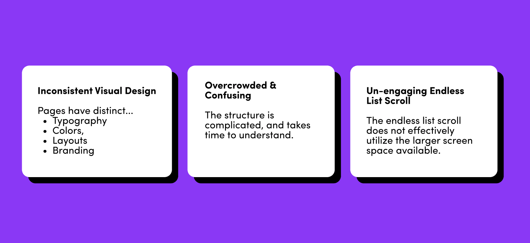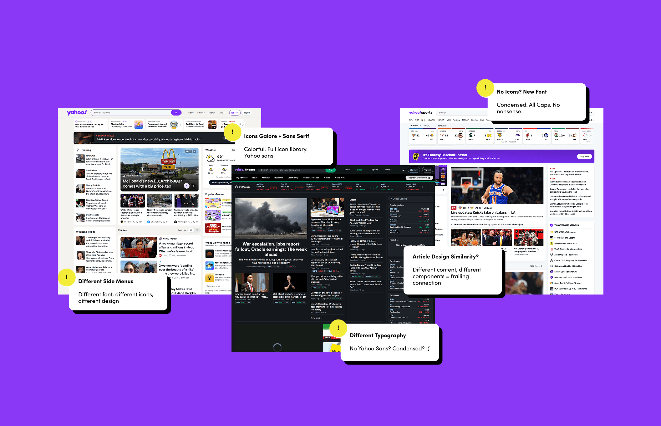 Over time, Yahoo struggled to keep up with modern UI. It also expanded and added new sites, which made the overarching platform feel increasingly disjointed. We identified several key issues across the news, finance, and sports pages.