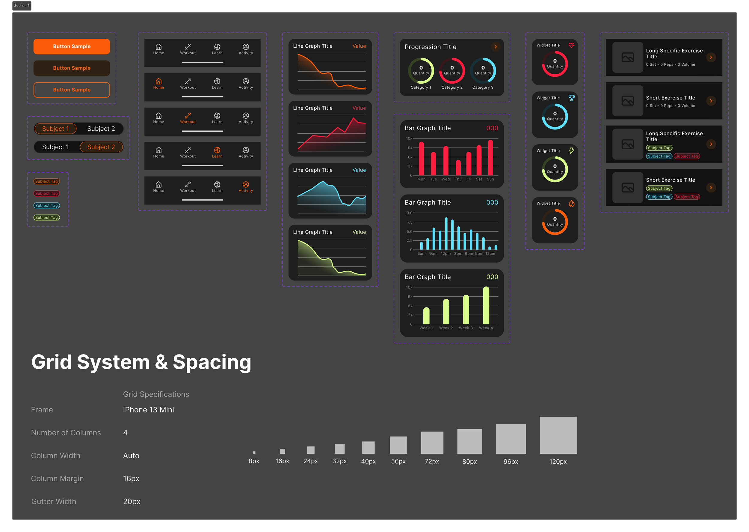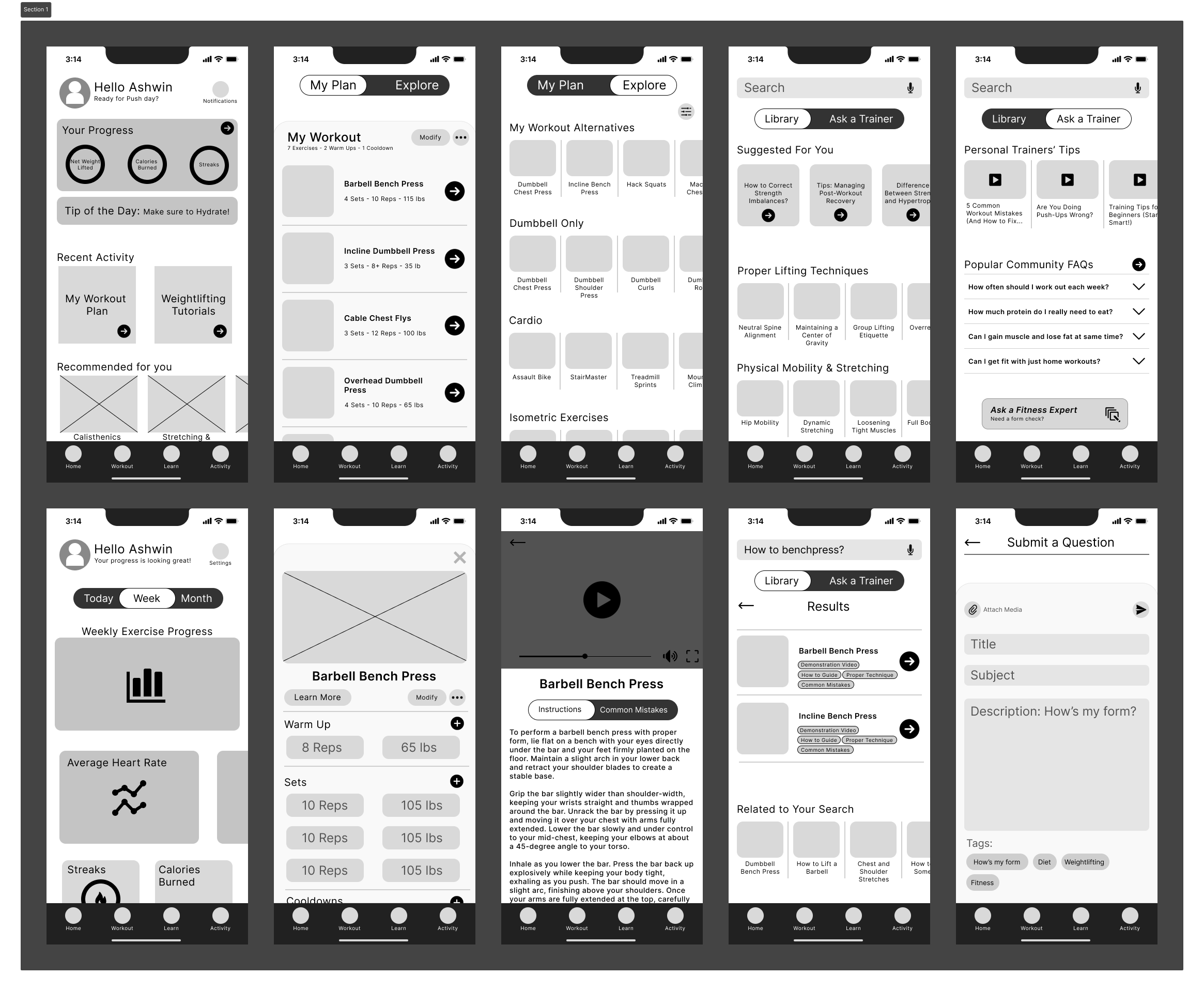 For the Smart Fitness App, I organized its core features into three core aspects: Workout, Learn, and Activity.